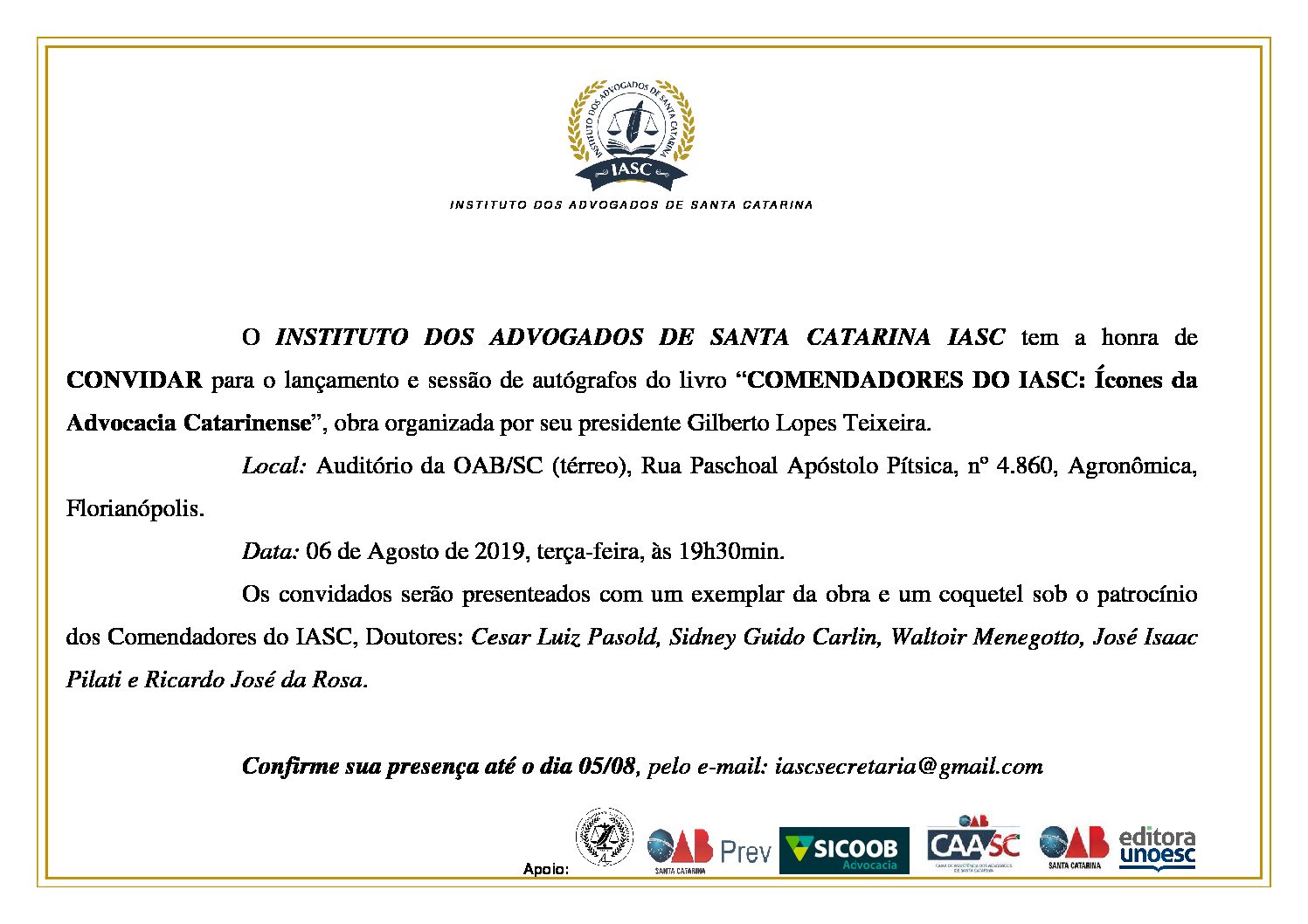 O INSTITUTO DOS ADVOGADOS DE SANTA CATARINA IASC tem a honra de CONVIDAR para o lançamento e sessão de autógrafos do livro “COMENDADORES DO IASC: Ícones da Advocacia Catarinense”, obra organizada por seu presidente Gilberto Lopes Teixeira.