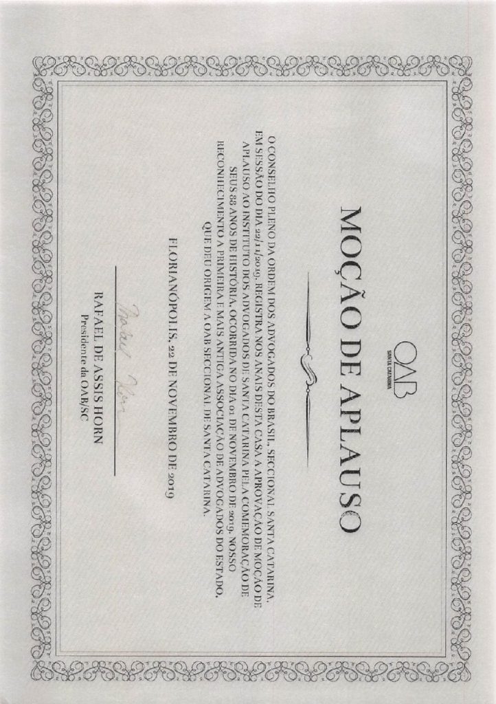 O Conselho Pleno da OAB/SC, em Sessão do dia 22/11/2019, aprovou Moção de Aplauso ao Instituto dos Advogados de Santa Catarina pela comemoração dos seus 88 anos de fundação (1º/11/1931).