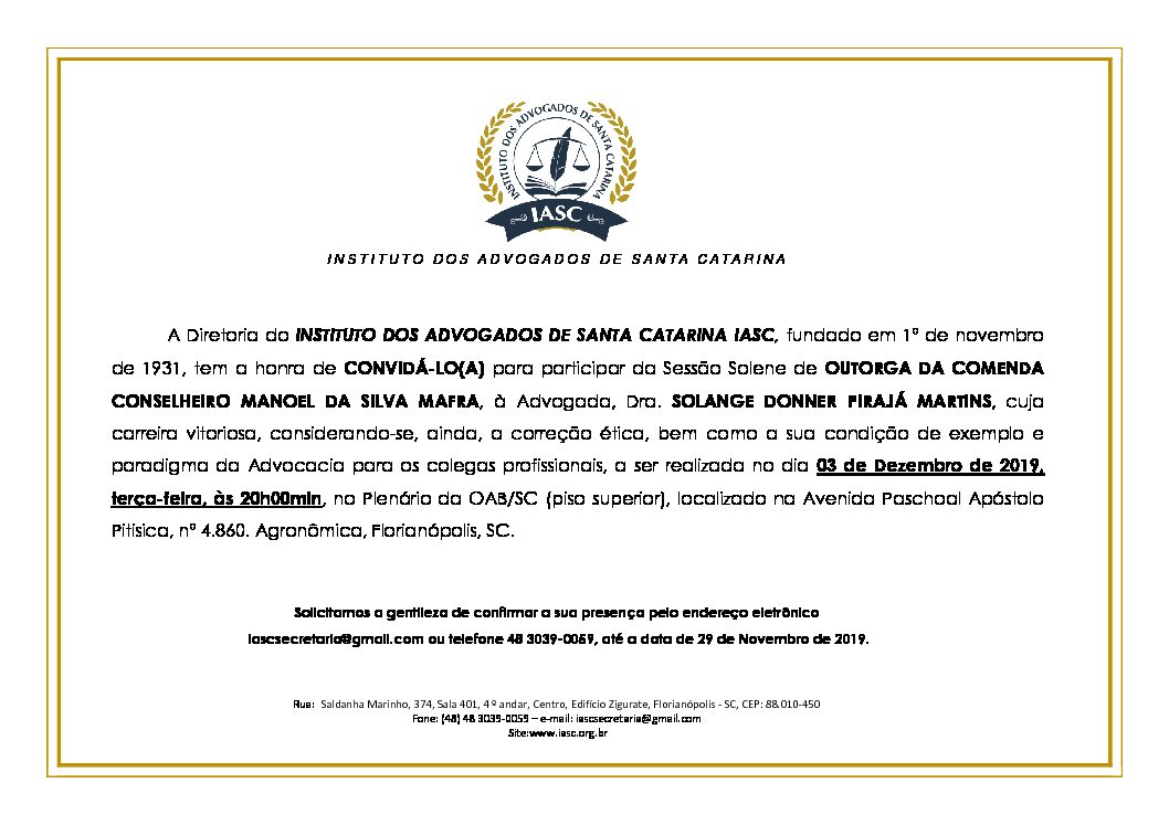 A Diretoria do INSTITUTO DOS ADVOGADOS DE SANTA CATARINA IASC, fundado em 1º de novembro de 1931, tem a honra de CONVIDÁ-LO(A) para participar da Sessão Solene de OUTORGA DA COMENDA CONSELHEIRO MANOEL DA SILVA MAFRA, à Advogada, Dra. SOLANGE DONNER PIRAJÁ MARTINS, cuja carreira vitoriosa, considerando-se, ainda, a correção ética, bem como a sua condição de exemplo e paradigma da Advocacia para os colegas profissionais, a ser realizada no dia 03 de Dezembro de 2019, terça-feira, às 20h00min, no Plenário da OAB/SC (piso superior), localizado na Avenida Paschoal Apóstolo Pitisica, nº 4.860. Agronômica, Florianópolis, SC.