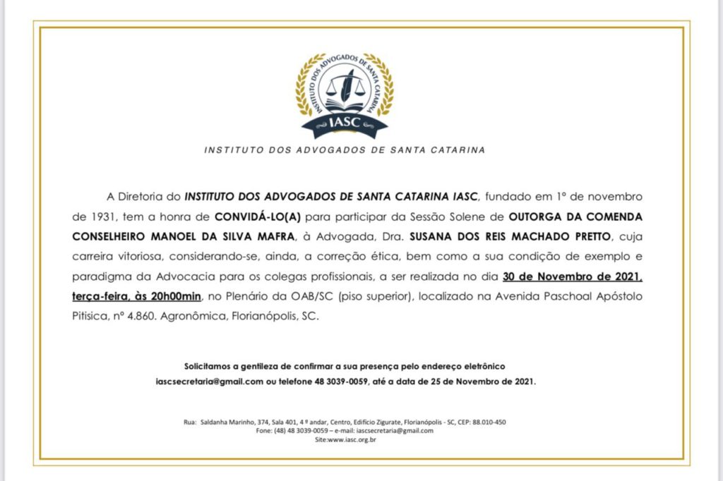 A Diretoria do INSTITUTO DOS ADVOGADOS DE SANTA CATARINA IASC, fundado em 1º de novembro de 1931, tem a honra de CONVIDÁ-LO(A) para participar da Sessão Solene de OUTORGA DA COMENDA CONSELHEIRO MANOEL DA SILVA MAFRA, à Advogada, Dra. SUSANA DOS REIS MACHADO PRETTO, cuja carreira vitoriosa, considerando-se, ainda, a correção ética, bem como a sua condição de exemplo e paradigma da Advocacia para os colegas profissionais, a ser realizada no dia 30 de Novembro de 2021, terça-feira, às 20h00min, no Plenário da OAB/SC (piso superior), localizado na Avenida Paschoal Apóstolo Pitisica, nº 4.860. Agronômica, Florianópolis, SC.