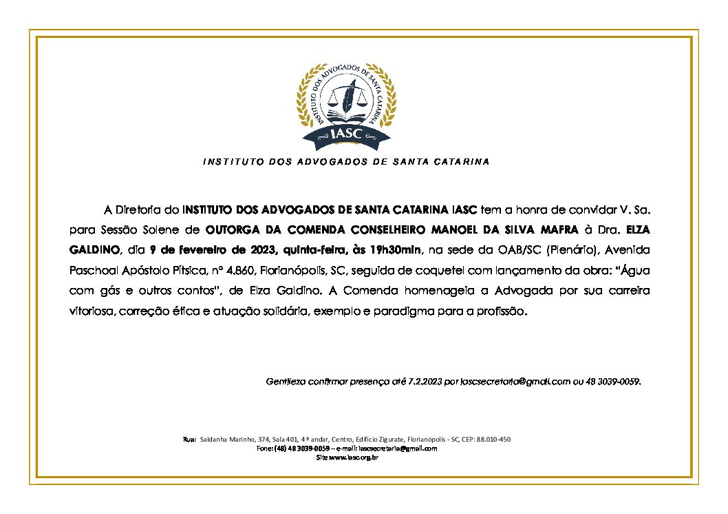 A Diretoria do INSTITUTO DOS ADVOGADOS DE SANTA CATARINA IASC tem a honra de convidar V. Sa. para Sessão Solene de OUTORGA DA COMENDA CONSELHEIRO MANOEL DA SILVA MAFRA à Dra. ELZA GALDINO, dia 9 de fevereiro de 2023, quinta-feira, às 19h30min, na sede da OAB/SC (Plenário), Avenida Paschoal Apóstolo Pítsica, nº 4.860, Florianópolis, SC, seguida de coquetel com lançamento da obra: “Água com gás e outros contos”, de Elza Galdino. A Comenda homenageia a Advogada por sua carreira vitoriosa, correção ética e atuação solidária, exemplo e paradigma para a profissão.